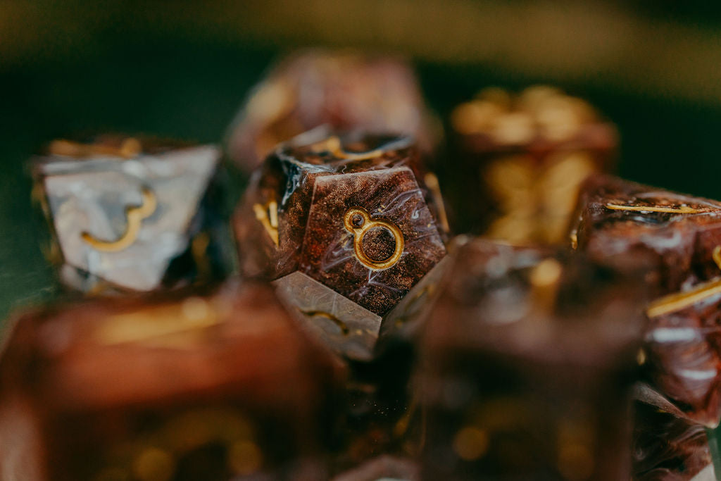 Are you in search of something truly unique? Or trying to raise an old design from the dead? Look no further! I craft bespoke artisanal dice sets, tailored to your tales. Whether you seek the shine and shimmer or something more rustic or natural - nigh anything is possible!