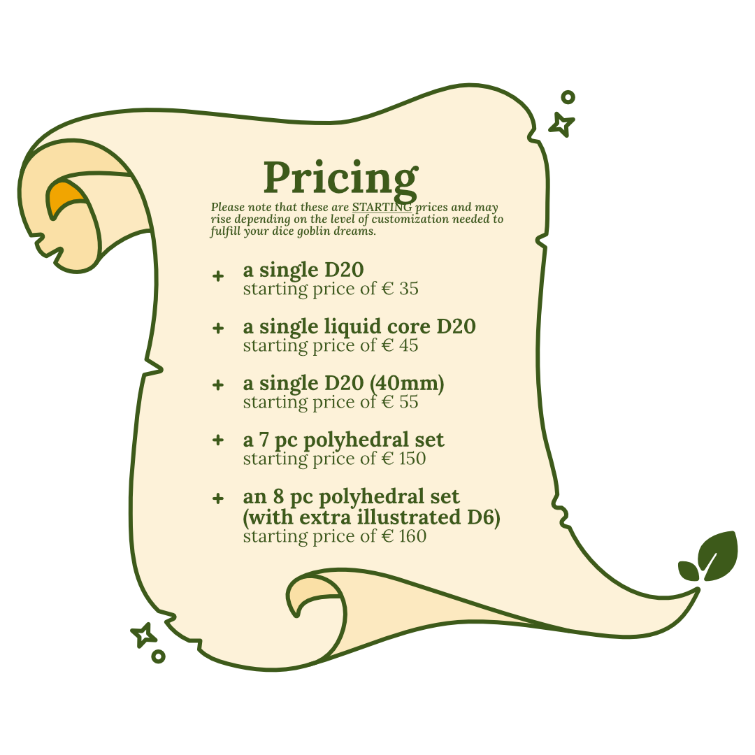 Once we’ve unravelled what you’d fancy, I’ll provide a more precise price, based on the complexity of the design and the materials needed. At this point, I’ll request a non-refundable deposit of 50% before we can embark on the fun part of our journey — creation! I’ll start by crafting a first set, sending you glimpses of the work as it progresses. If the dice don’t quite match your vision, worry not; the base commission price includes one re-pour to ensure we’re on the right path. Should the fates require further adjustments beyond this, I must ask for a small fee of €15,- (excl. VAT) per hour for the additional labour.